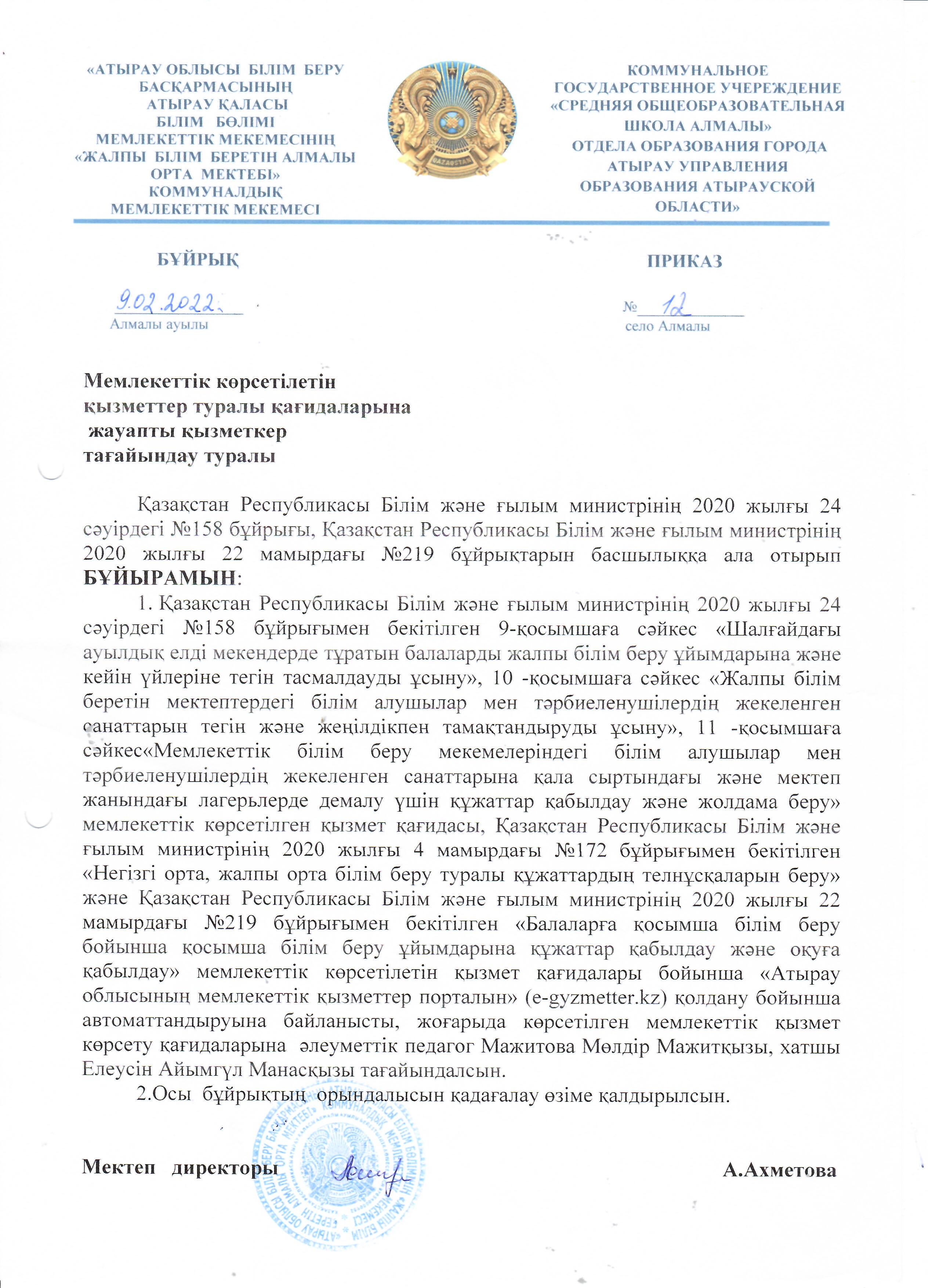 « Атырау облысы білім беру басқармасының Атырау қаласы білім бөлімі мемлекеттік мекемесінің «Жалпы білім беретін Алмалы орта мектебі» коммуналдық мемлекеттік мекемесі |