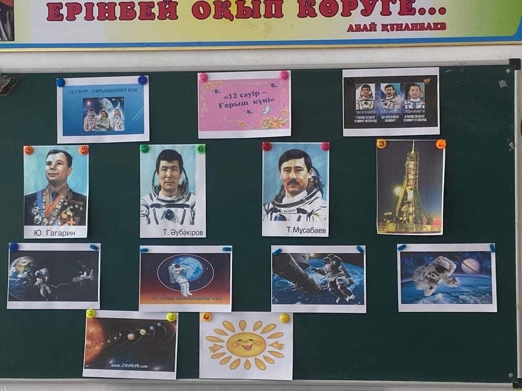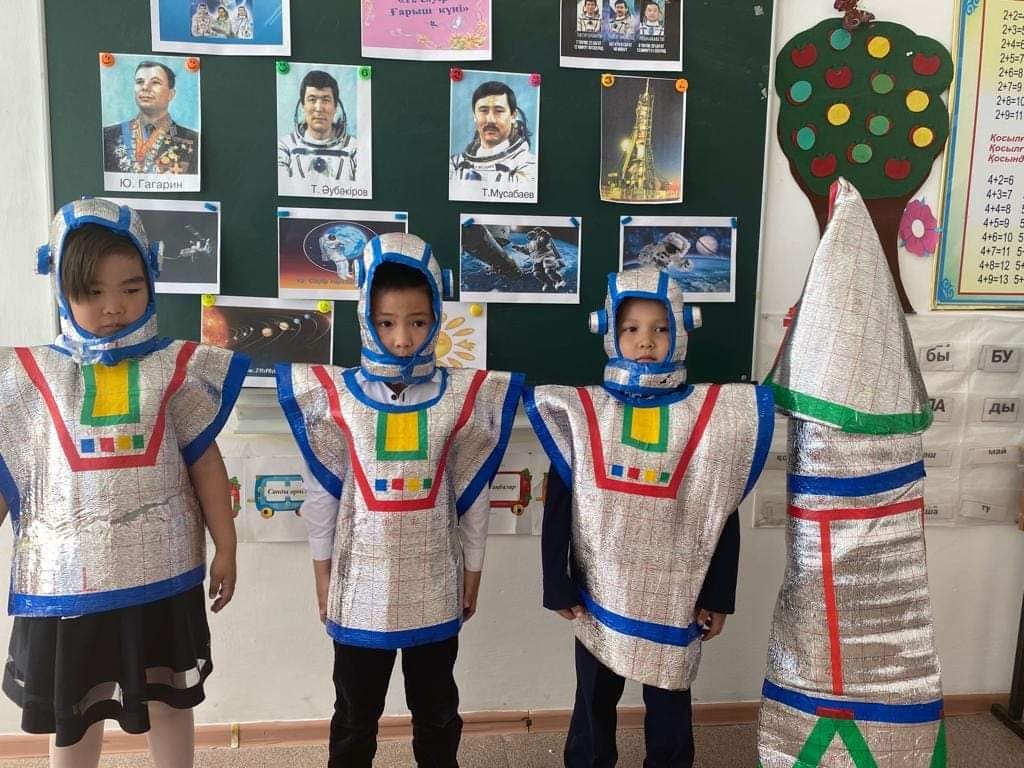 Елімізде ғарышкерлер күні қарсаңында өткізілген «Ғарыш әлеміне саяхат» тақырыбында 1 сыныптар арасында өткізіп отыр.