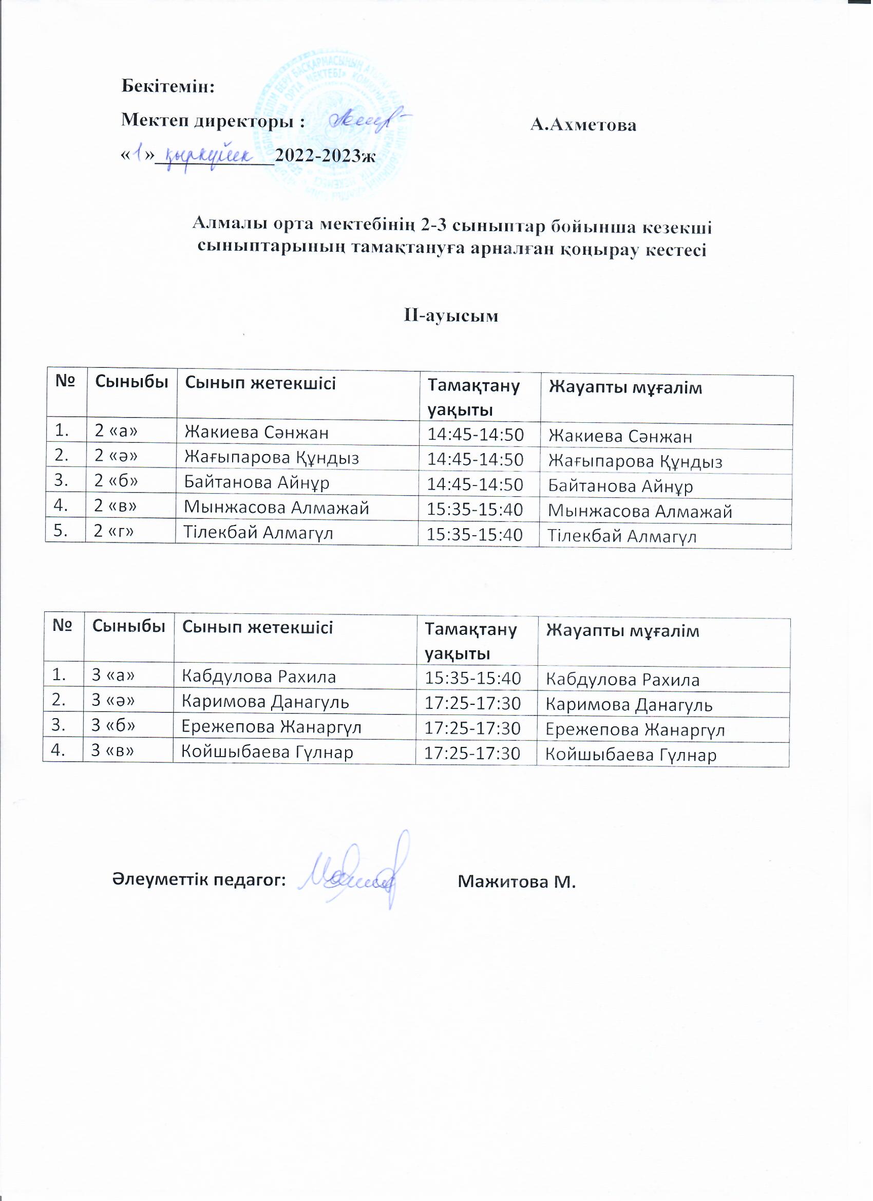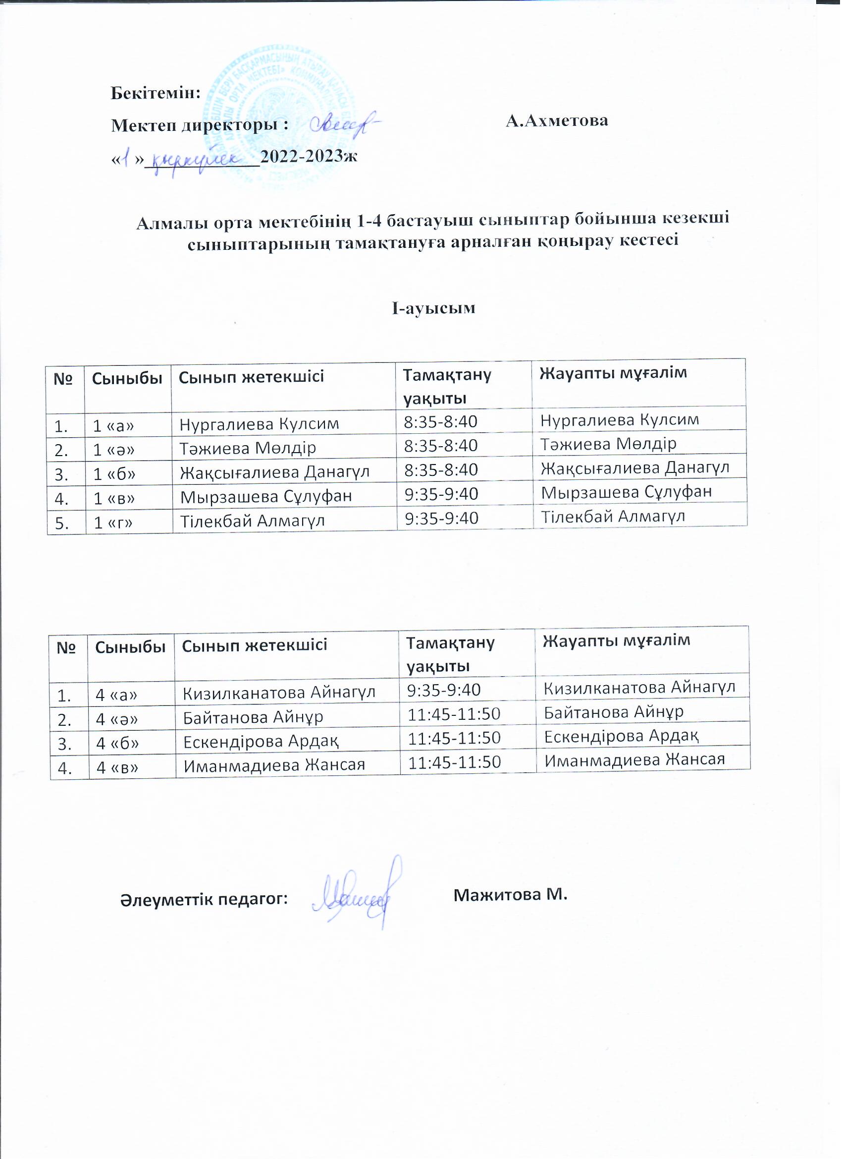 Тамақтануға арналған қоңырау кестесі 1 - 2 аусым