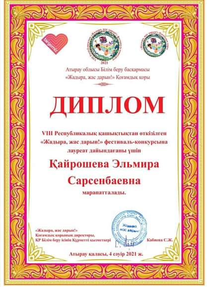 Фестиваль-конкурсқа лауреат дайындағаны үшін мектебіміздің жоғары санатты музыка пәні мұғалімі Кайрошева Эльмира марапатталды.