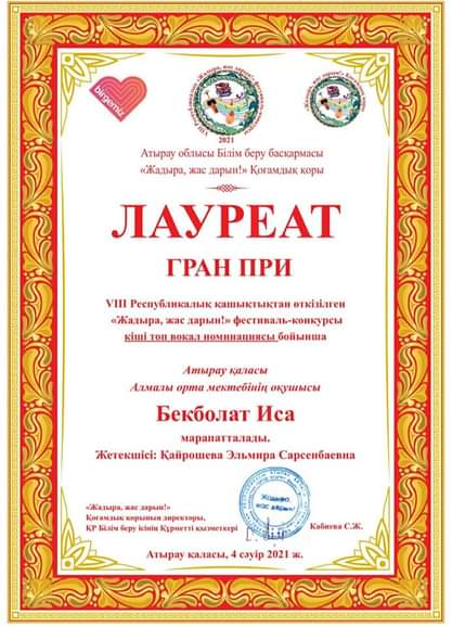 VIII Республикалық қашықтан өткізілген “Жадыра,жас дарын!” фестиваль-конкурсында ГРАН ПРИМЕН кіші топ вокал номинациясы бойынша 4 “ә” сынып оқушысы Бекболат Иса және Лауриат үлкен топ вокал номинациясы бойынша 7 “ә” сынып оқушысы Даниярқызы Әсемнұр марапатталды.